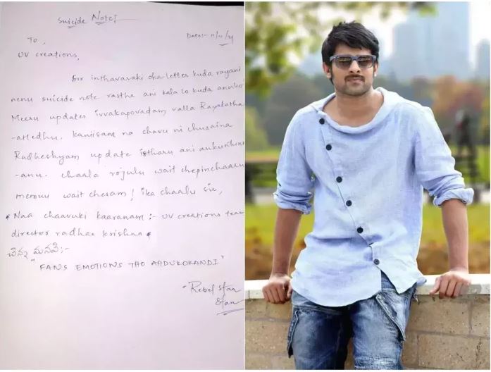 ଆପଣଙ୍କ ସୂଚନା ପାଇଁ କହିରଖୁଛୁ ଯେ ଏହାପୂର୍ବରୁ ମଧ୍ୟ ପ୍ରଭାସଙ୍କ ପାଇଁ ଜଣେ ଫ୍ୟାନ ଆତ୍ମହତ୍ୟା କରିବାକୁ ଚେଷ୍ଟା କରିଥିଲେ । ବାସ୍ତବରେ ଫିଲ୍ମ ରାଧେଶ୍ୟାମ ମେକର୍ଷ ତରଫରୁ କୌଣସି ଅପଡେଟ ନ ମିଳିବାରୁ ଫ୍ୟାନ ମେକର୍ଷଙ୍କ ବିରୋଧରେ ସୁସାଇଡ ନୋଟ ଲେଖି ଆତ୍ମହତ୍ୟା କରିବାକୁ ଧମକ ଦେଇଥିଲେ ।