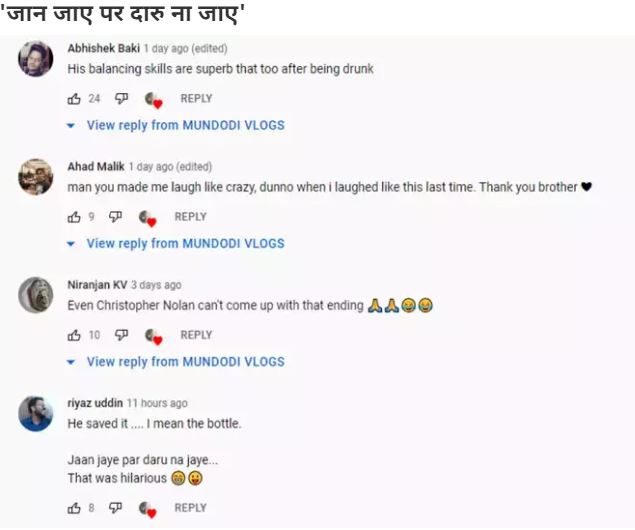 ଏହି ଭିଡ଼ିଓରେ କୌଣସି ମଜାଳିଆ ମୁହୂର୍ତ୍ତ ତ ନାହିଁ କିନ୍ତୁ ଯୁବକଟି ପଡ଼ିସାରିଲା ପରେ ମଧ୍ୟ ତା’ ହାତରୁ ମଦ ବୋତଲ ପଡୁନାହିଁ। ଏହାକୁ ଦେଖି ଜଣେ ୟୁଜର୍ସ ଲେଖିଥିଲେ, “ଜାନ ଯାଏ ମଗର ଦାରୁ ନାଜାଏ”। କିଛି ୟୁଜର୍ସ ଏହାକୁ ପସନ୍ଦ କରିନଥିଲେ ଓ କିଛି ଏହାକୁ ବାରମ୍ବାର ଦେଖୁଛନ୍ତି।