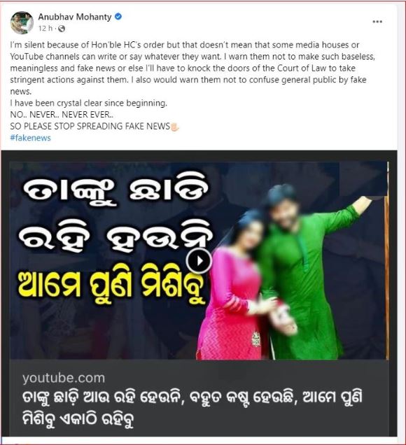 ଏଭଳି ଅଯଥା ମିଥ୍ୟା ଓ ଭିତ୍ତିହୀନ ଖବର ପରିବେଷଣରୁ ବିରତ ରହିବାକୁ ଅନୁଭବ ସଂପୃକ୍ତ ଗଣମାଧ୍ୟମ ସଂସ୍ଥା ଓ ୟୁଟ୍ୟୁବ ଚ୍ୟାନେଲକୁ ଚେତାବନୀ ଦେଇଛନ୍ତି । ସୋଶାଲ ମିଡିଆରେ ଏନେଇ ପୋଷ୍ଟ କରି ଅନୁଭବ ଲେଖିଛନ୍ତି ଯେ, ହାଇକୋର୍ଟଙ୍କ ନିର୍ଦ୍ଦେଶରେ ସେ ନିରବତା ଅବଲମ୍ବନ କରିଛନ୍ତି । ତା’ ମାନେ ନୁହେଁ ଯେ, କିଛି ଗଣମାଧ୍ୟମ ସଂସ୍ଥା ଓ ୟୁଟ୍ୟୁବ ଚ୍ୟାନେଲ ମନକୁ ଯାହା ଆସିବ ତାହା ଲେଖିବେ ବା କହିବେ । ଲୋକଙ୍କୁ ଦ୍ୱନ୍ଦରେ ନ ପକାଇବାକୁ ସେମାନଙ୍କୁ ଅନୁଭବ ଚେତାବନୀ ଦେବା ସହ ଭବିଷ୍ୟତରେ ଏପରି କଲେ କାଠଗଡ଼ାକୁ ଟାଣିବେ ବୋଲି ଚରମବାଣୀ ଶୁଣାଇ ଦେଇଛନ୍ତି ।