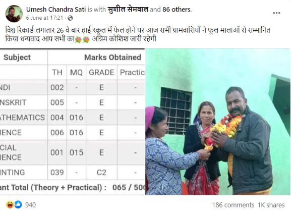 ଜୁନ 6 ତାରିଖରେ ୟୁପି ବୋର୍ଡ଼ର ରେଜଲ୍ଟ ଘୋଷଣା କରାଯାଇଥିଲାଏହାମଧ୍ୟରେ ଉମେଶ ଚନ୍ଦ୍ର ସତି ନାମକ ଫେସବୁକ ଆକାଉଣ୍ଟରୁ ଏକ ଫୋଟ ଶେୟର ହୋଇଥିଲା। ଯେଉଁଥିରେ ଲେଖାଥିଲା, ହାଇସ୍କୁଲରେ ୨୬ ଥର ଫେଲ ହୋଇ ବିଶ୍ବରେକର୍ଡ଼ ହାସଲ କରିଥିବାରୁ ଫୁଲମାଳରେ ସ୍ୱାଗତ କରାଯାଉଛି। ଏଥିରେ ଆହୁରି ଲେଖାଥିଲା ସମସ୍ତଙ୍କୁ ଧନ୍ୟବାଦ ଏମିତି ଆହୁରି ଆଗକୁ ପ୍ରଚେଷ୍ଟା ଜାରି ରହିବ। ଯେତେବେଳେ ଏହି ମାମଲା ଉପରୁ ସତ୍ୟତା ଜାଣିବା ପାଇଁ ଚେଷ୍ଟା କରାଯାଇଥିଲା ସେତେବେଳେ କିଛି ମାମଲା ସାମ୍ନାକୁ ଆସିଥିଲା ଓ ଜଣାପଡ଼ିଲା ଏହା ସମ୍ପୂର୍ଣ୍ଣ ଭାବରେ ଫେକ ଅଟେ।