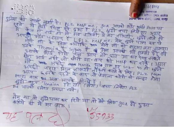ସୋସିଆଲ ମିଡ଼ିଆରେ ଭାଇରାଲ ହେଉଥିବା ଏହି ଫୋଟରେ ଦେଖିପାରିବେକି ଏହି ମାମଲା କାନପୁରର ଜାଜମଓ ସ୍ଥିତ କୌଣସି ବାଳିକା ଇଣ୍ଟର କଲେଜର ଅଟେ। ଛାତ୍ରୀ ନିଜର କପିର ଶେଷ ପୃଷ୍ଠାରେ ଲେଖିଲେ,’ଦୁନିଆର ସବୁ ଖୁସି ଦିଅନ୍ତୁ। ମୋତେ ସାହାଯ୍ୟ କରନ୍ତୁ। ଭଗବାନ ଆପଣଙ୍କୁ ଆହୁରି ଉଚ୍ଚ ପୋଷ୍ଟରେ ରଖନ୍ତୁ। ଏହା ମୋର ହୃଦୟରୁ ନିବେଦନ। ମୋତେ ବଞ୍ଚାଇନିଅନ୍ତୁ। ଯଦି ମୁଁ ବିଫଳ ହୋଇଯାଏ ତେବେ ମୁଁ ମରିଯିବି। ମୋତେ ତାନା ଠାରୁ ଭଲ ଲାଗେ ମରିଯିବା। ମୋତେ ସାହାଯ୍ୟ କରନ୍ତୁ। ମ୍ୟାମ ମୋତେ ପାସ କରିଦିଅନ୍ତୁ ମୋର ମାଆଙ୍କ ପାଇଁ, କାରଣ ମୋ ମାଆଙ୍କୁ ସଦମା ଲାଗିଯିବ।’