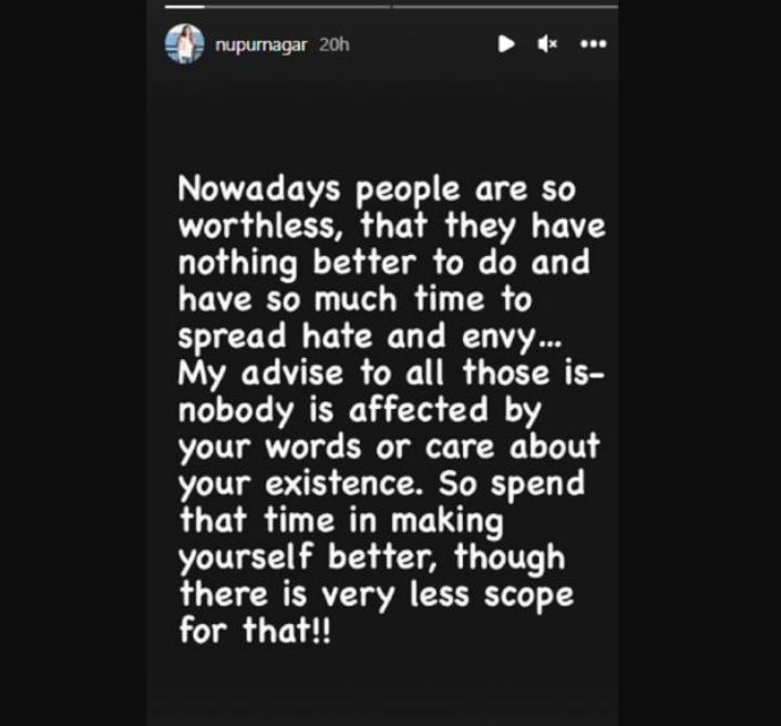 ନିକଟରେ ନୁପୁର ନିଜr ଇନଷ୍ଟାଗ୍ରାମରେ ଏକ କାହାଣୀ ସେୟାର କରିଥିଲେ। ଏଥିରେ ଲେଖାଥିଲା ଯେ, “ଆଜିକାଲି ଲୋକମାନେ ସମ୍ପୂର୍ଣ୍ଣ ଭେଲେ ହୋଇପଡିଛନ୍ତି। ସେମାନଙ୍କର କୌଣସି କାମ ନାହିଁ। ଲୋକମାନେ ଏତେ ଫାଙ୍କା ଅଛନ୍ତିଯେ ତାଙ୍କ ପାଖରେ ଘୃଣା ବିସ୍ତାର କରିବାକୁ ସେମାନଙ୍କର ବହୁତ ସମୟ ଅଛି। ସମସ୍ତଙ୍କୁ ମୋର ସମସ୍ତଙ୍କୁ ଉପଦେଶ ହେଉଛିକି ଆପଣଙ୍କ କଥାରୁ କାହାରିକୁ କିଛି ଫରକ ପଡେ ନାହିଁ। ଆପଣଙ୍କର ଉପସ୍ଥିତି ମଧ୍ୟ କାହାରିକୁ ଫରକ ପକାଏ ନାହିଁ। ତେଣୁ ଆପଣ ନିଜକୁ ଉନ୍ନତ କରିବା ପାଇଁ ଏହି ସମୟ ନେବା ଉଚିତ। ଏହାର ସମ୍ଭାବନା (ଭଲ ହେବାର)ମଧ୍ୟ ବହୁତ କମ ଅଟେ।