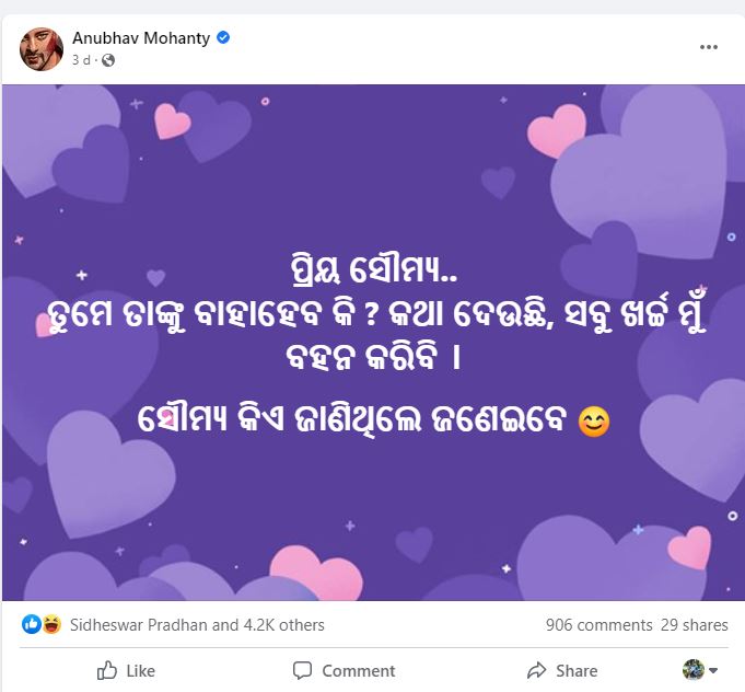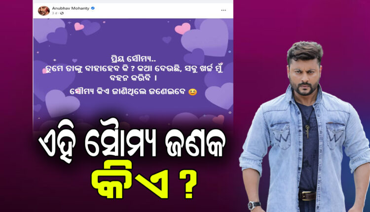 କିନ୍ତୁ ଏବେ ସାମାଜିକ ଗଣମାଧ୍ୟମରେ ଅନୁଭବଙ୍କ ଗୋଟିଏ ଲେଖାକୁ ନେଇ ଭାରି ଚର୍ଚ୍ଚା ଧରିଛି । ସମସ୍ତେ ପ୍ରଶ୍ନ କରୁଛନ୍ତି ସୌମ୍ୟ ବାବୁ କିଏ ? ଦେଖନ୍ତୁ କ’ଣ ଲେଖଛନ୍ତି ଅନୁଭବ । ‘ପ୍ରିୟ ସୌମ୍ୟ… ତୁମେ ତାଙ୍କୁ ବାହା ହେବ କି ? କଥା ଦେଉଛି, ସବୁ ଖର୍ଚ୍ଚ ମୁଁ ବହନ କରିବି । ତା’ପରକୁ ସେ ଲେଖନ୍ତି ଯେ ସୌମ୍ୟ କିଏ ଜାଣିଥିଲେ ଜଣେଇବେ ।