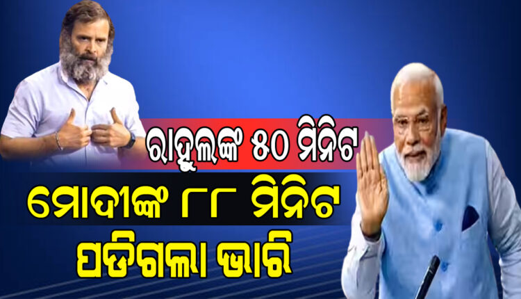 ସଂସଦରେ ବିଗତ ଦୁଇଦିନ ଧରି ମାହୋଲ ଗରମ ଚାଲିଛି। ମଙ୍ଗଳବାର ଦିନ ରାହୁଲ ଗାନ୍ଧୀ ପ୍ରଧାନମନ୍ତ୍ରୀ ନରେନ୍ଦ୍ର ମୋଦିଙ୍କୁ ଟାର୍ଗେଟ କରିଥିଲେ। ରାହୁଲ, ଆଦାନୀ ମାମଲାକୁ ନେଇ କେନ୍ଦ୍ର ସରକାର ଓ ପିଏମଙ୍କ ଉପରେ ଅଙ୍କ କସିଥିଲେ। ଏହାପରେ ବୁଧବାର ଦିନ ପ୍ରଧାନମନ୍ତ୍ରୀ ନରେନ୍ଦ୍ର ମୋଦି ଲୋକସଭାରେ ନିଜର ସମ୍ବୋଧନ ଦେଇଥିଲେ। ଏହାମଧ୍ୟରେ କେନ୍ଦ୍ରସରକାର ମଧ୍ୟ ପଲଟା ଜବାବ ଦେଇଥିଲେ। ଖାଆସ କଥା ଏହା ହେଉଛି କି, ନିଜର 88 ମିନିଟର ଭାଷଣରେ ପିଏମ ରାହୁଲ ଗାନ୍ଧୀଙ୍କ ନାମ ନେଇନଥିଲେ।